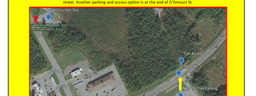 Please be advised that commencing Monday, 19 April 2021, the Gateway Wetland parking lot and picnic area off Gateway Drive will be closed as construction for the new visitor and interpretive centre will begin. Most of the trail is still accessible, and parking is available at Canadian Tire Oromocto on Miramichi Road. Please see the image below. A Wetland trail access point is directly across from Canadian Tire and there is a crosswalk leading to it. Please use caution when crossing this busy street. Another parking and access option is at the end of D’Amours St.