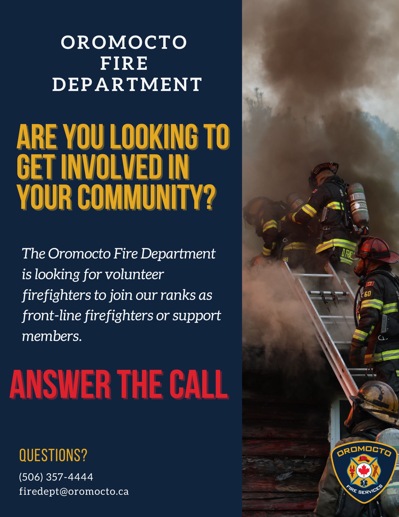 The Oromocto Fire Department is seeking dedicated individuals to join our team as front-line volunteer firefighters or support members. This is a rewarding opportunity to serve your community, gain valuable skills, and be part of a strong team.