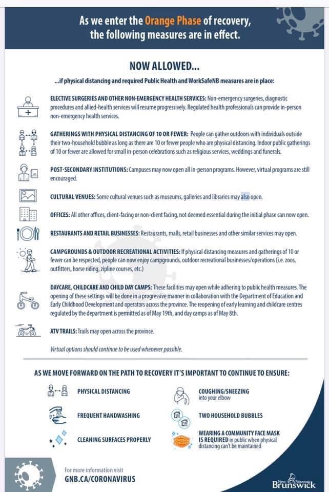The province has declared we have reached Orange level. What that means is that subject to the Public Health and WorkSafe NB COVID-19 general guidance, the following activities are allowed: