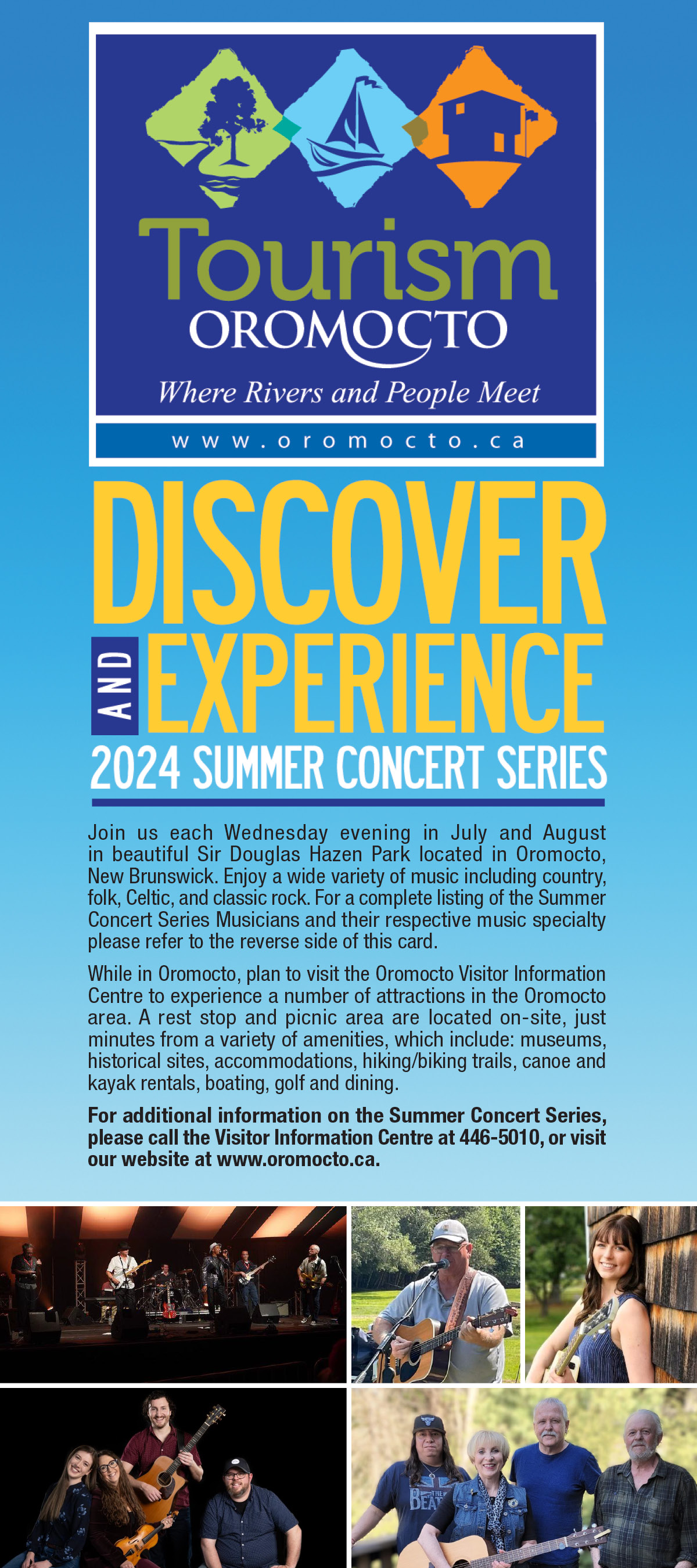 Discover and experience local musicians and wonderful music, with our Summer Concert Series featured each Wednesday evening in July and August in picturesque Sir Douglas Hazen Park, located next to the Oromocto River, where rivers and people meet. Enjoy a wide variety of music including country, folk, classic, rock, contemorary and a number of local dancers performing highland, irish and step dancing.