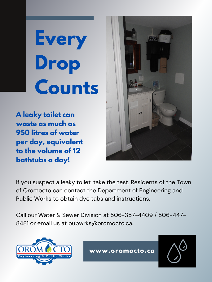 Every Drop CountsA leaky toilet can waste as much as 950 litres of water per day, equivalent to the volume of 12 bathtubs a day! If you suspect a leaky toilet, take the test. Residents of the Town of Oromocto can contact the Department of Engineering & Public Works to obtain dye tabs and instructions. Call our Water & Sewer Division at 506-447-8481 or email us at