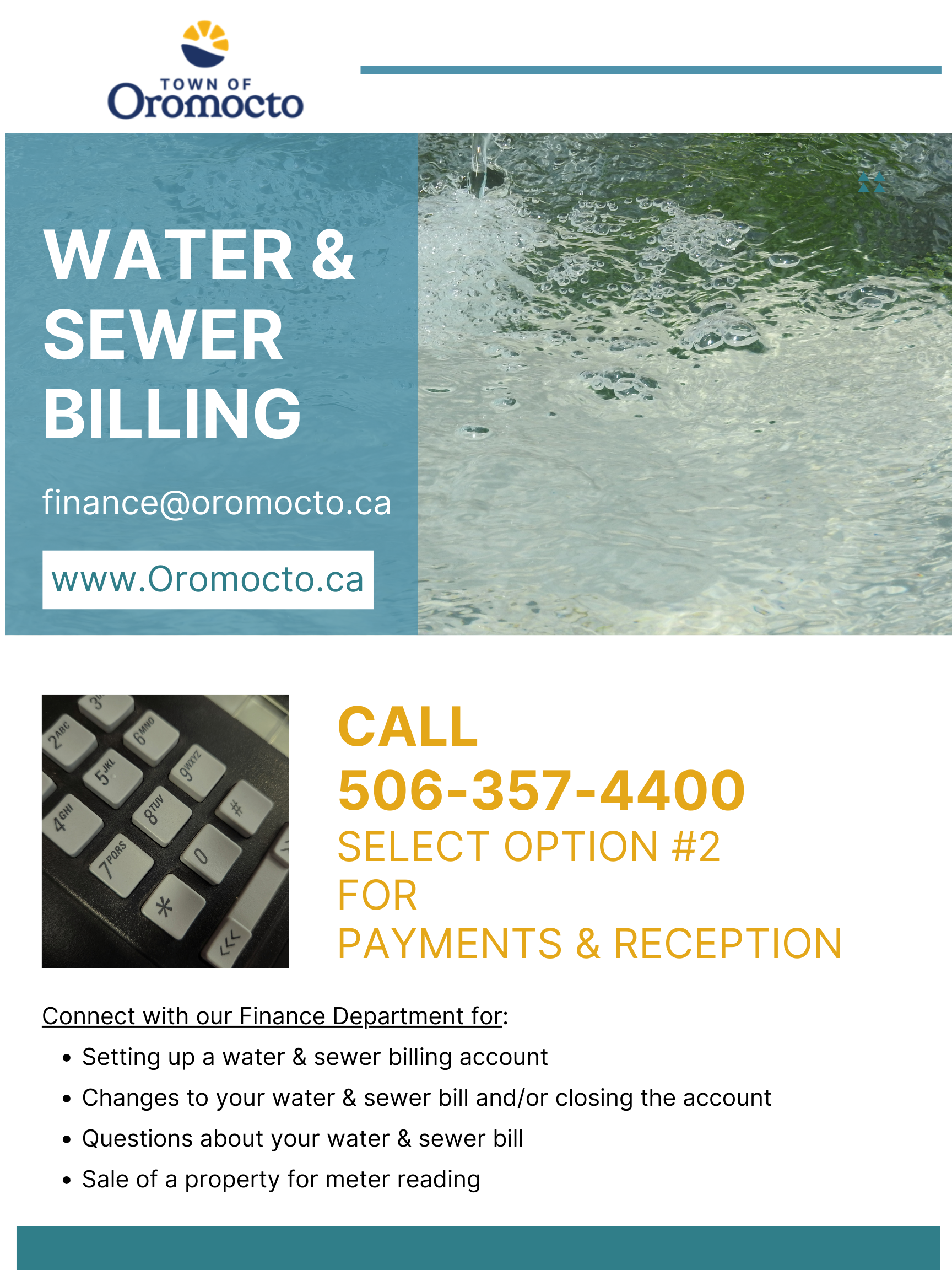 24/7 Emergency Water/Sewer contact number 506-447-8481, Non-urgent email: publicworks@oromocto.ca